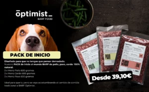 El Pack de Inicio de Barf Optimist incluye 9 menús monoproteicos, raciones calculadas y guía de transición. La forma más